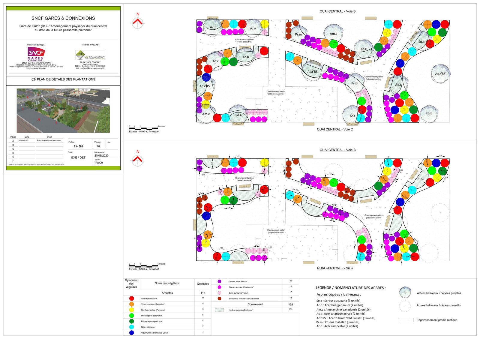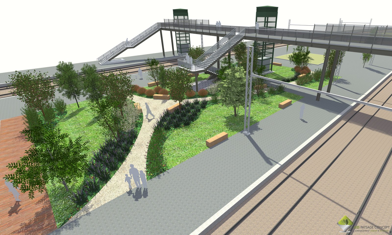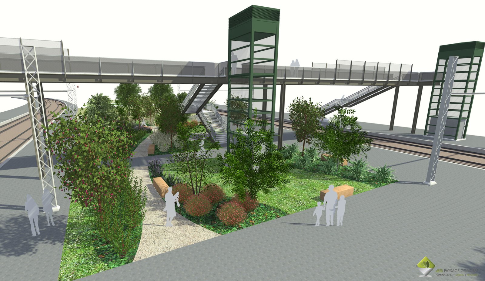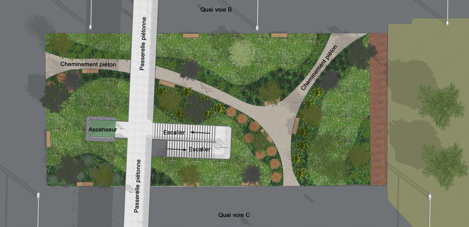 Dans le cadre du projet de construction de la nouvelle passerelle piétonne au sein de la gare de Culoz, le Maître d’Ouvrage (SNCF Gares & Connexions) a souhaité mettre l’accent sur l’intégration paysagère de la nouvelle passerelle. Nous avons ainsi pu concevoir un projet d’aménagement paysager de qualité sur le quai central de la gare afin de permettre aux voyageurs qui attendent leur train de déambuler à proximité des plantations mais également de se reposer sous la fraicheur des arbres.