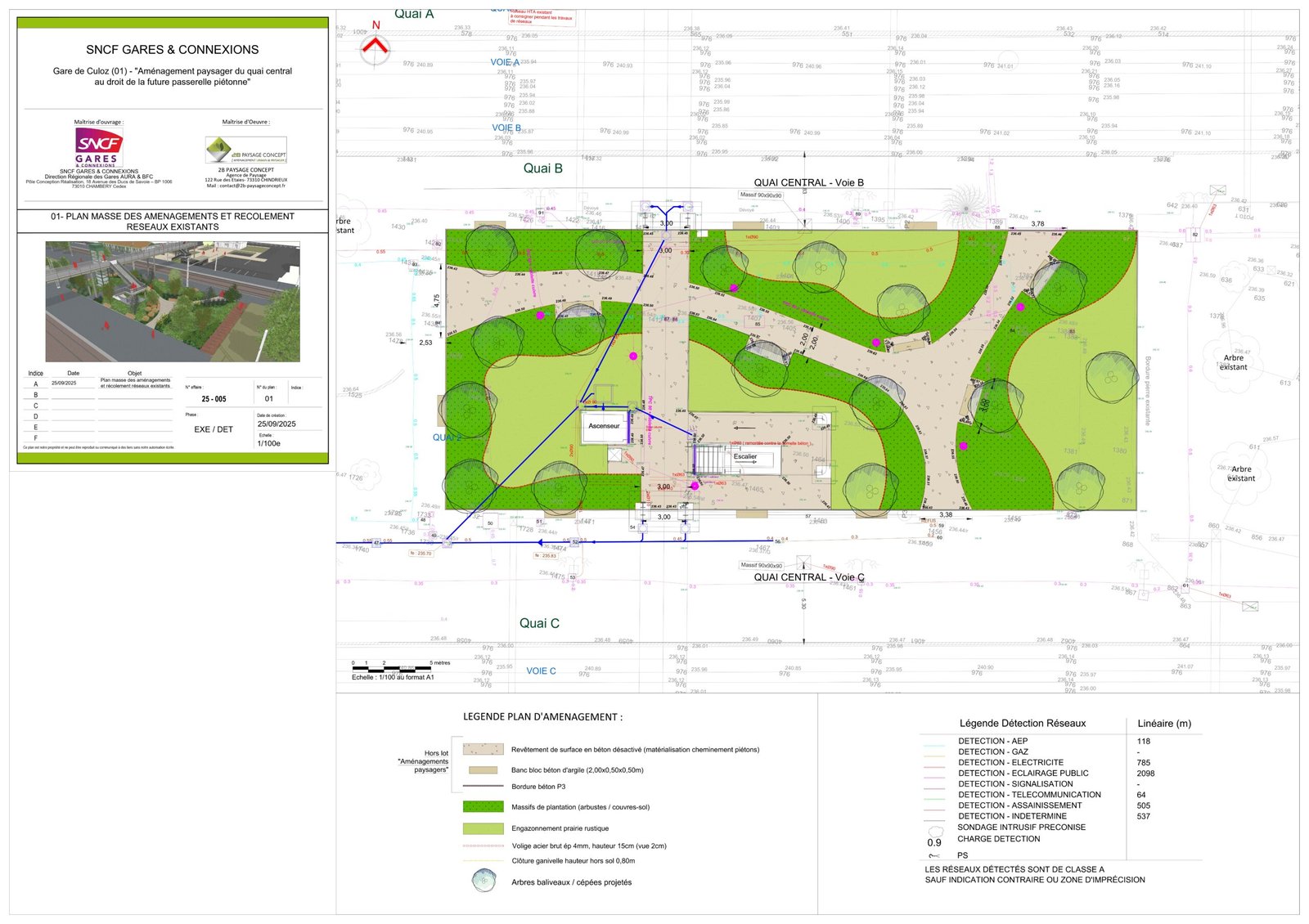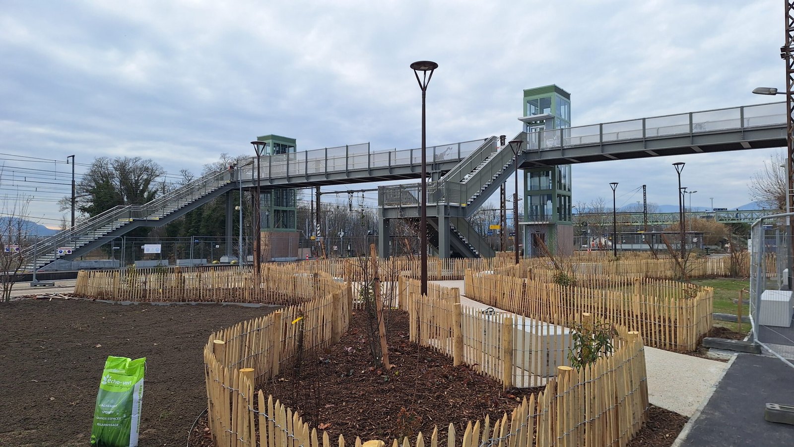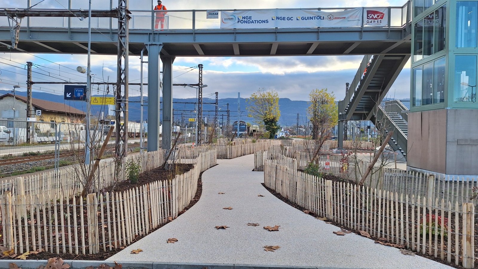 Dans le cadre du projet de construction de la nouvelle passerelle piétonne au sein de la gare de Culoz, le Maître d’Ouvrage (SNCF Gares & Connexions) a souhaité mettre l’accent sur l’intégration paysagère de la nouvelle passerelle. Nous avons ainsi pu concevoir un projet d’aménagement paysager de qualité sur le quai central de la gare afin de permettre aux voyageurs qui attendent leur train de déambuler à proximité des plantations mais également de se reposer sous la fraicheur des arbres.