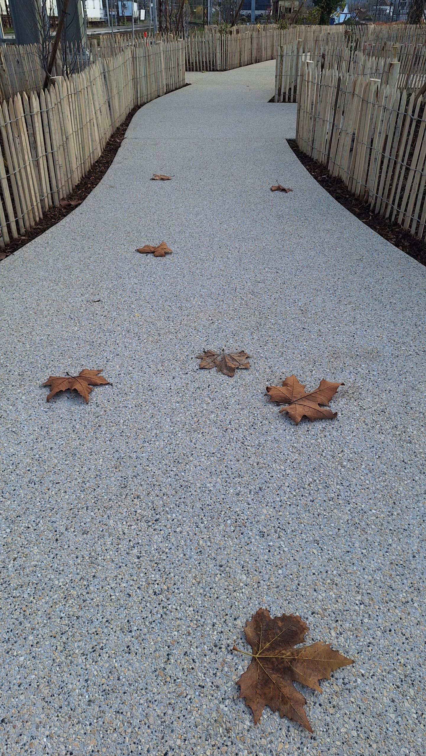 Différentes essences d’arbres indigènes (essentiellement baliveaux et cépées) ont soigneusement été sélectionnées en pépinière avec le client afin de créer des espaces piétons ombragés, apportant également de remarquables couleurs automnales (érables, arbre de fer, amélanchier,…). Du mobilier complémentaire a été prévu pour faire de cet espace un lieu convivial et sécurisé (bancs, éclairage,…).
