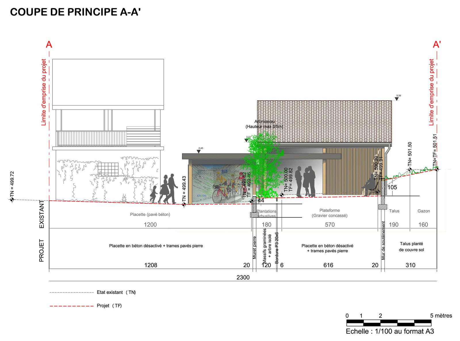 - Intégrer un abri bus / local semi ouvert / sanitaires publics sur la placette,