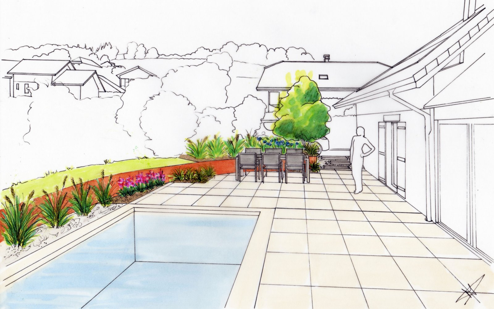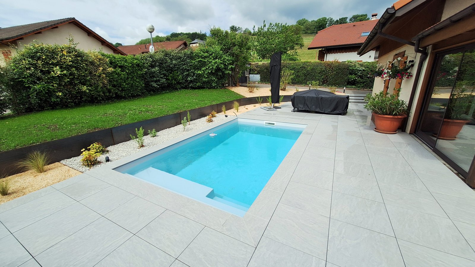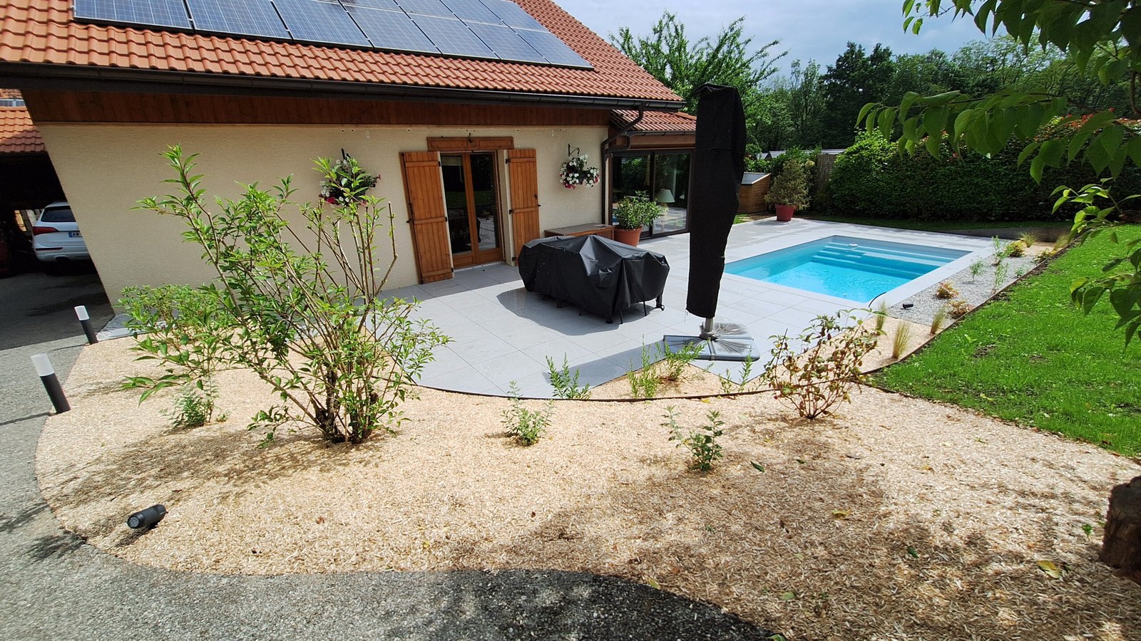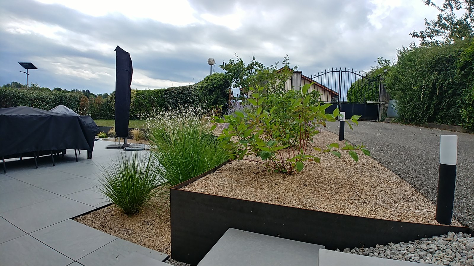 Réagencement de la terrasse principale avec remplacement de la piscine hors sol existante par une piscine coque parfaitement intégrée dans ce jardin étriqué. Le muret en acier corten vient se fondre dans le jardin et délimite parfaitement l’espace de vie extérieur principal. Le dallage en grès cérame